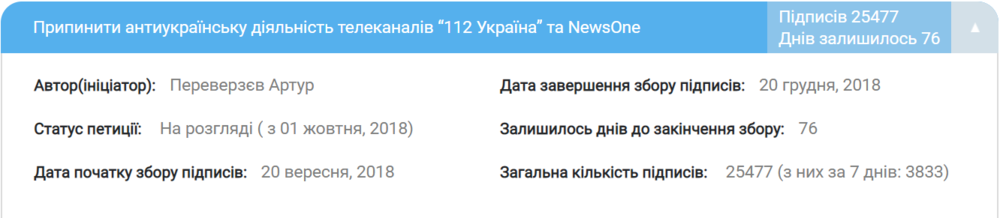 Однако судебная тягомотина властям была явно ни к чему. И на сайте Верховной Рады появилась петиция с требованием "Прекратить антиукраинскую деятельность телеканала "112 Украина" и Newsone". Петиция была внесена волонтером Артуром Переверзевым (соратником советника президента Юрия Бирюкова).