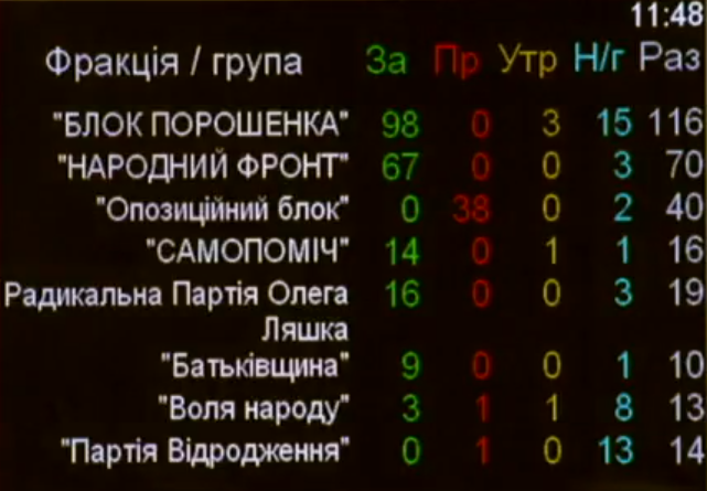 Так, на заседании присутствовало 116 депутатов от фракции "БПП" из 135, из них 98 человек проголосовало за, 15 не голосовало вовсе, трое воздержалось. К слову, среди воздержавшихся - журналист, один из создателей "Громадського телебачення" Мустафа Найем.