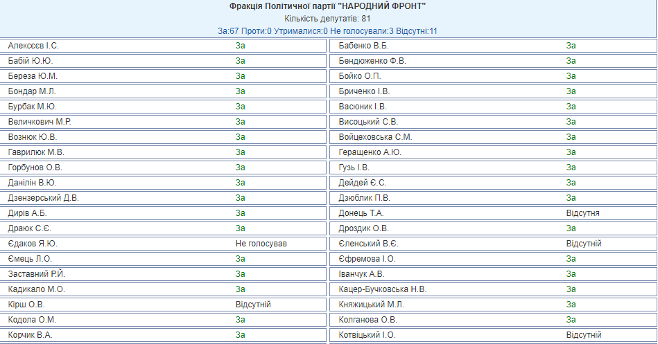 От фракции "Народный фронт" на сегодняшнюю сессию пришло 70 депутатов из 81, трое из присутствующих не голосовали, остальные 67 выступили "за".