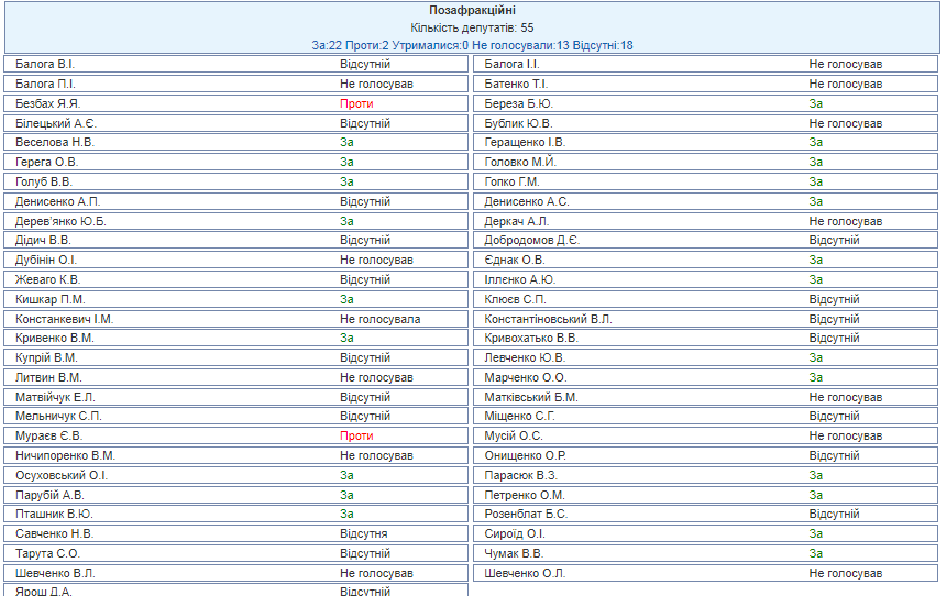 Из 55 внефракционных депутатов на голосовании присутствовали 37, из них 13 не принимали участие, "за" выступили 22 человека, "против" - всего двое: нардепы Мураев и Безбах.