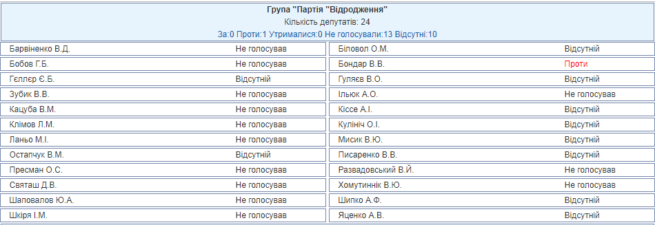 Голоса "Відродження" распределились следующим образом: "за" не проголосовал никто, "против" выступил нардеп Бондарь, 13 человек не голосовали, а еще 10 отсутствовали на сессии.