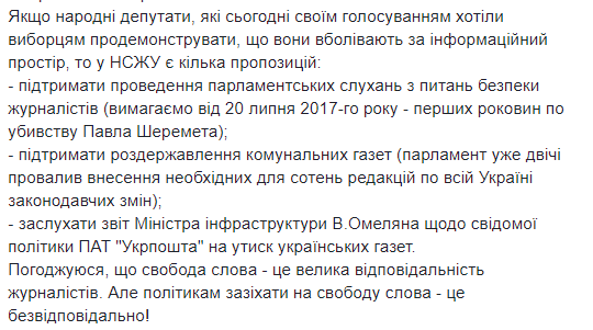 Также в НСЖУ озвучили ряд предложений от журналистов: