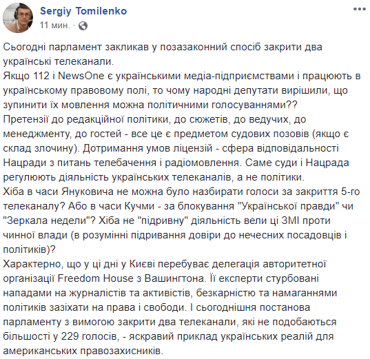 "Если есть претензии к редакционной политики, к сюжетам, к ведущим, к менеджменту, к гостям - все это является предметом судебных исков (если есть состав преступления). Соблюдение условий лицензий - сфера ответственности Нацсовета по вопросам телевидения и радиовещания. Именно суды и Нацсовет регулируют деятельность украинских телеканалов, а не политики", - отметил Томиленко.