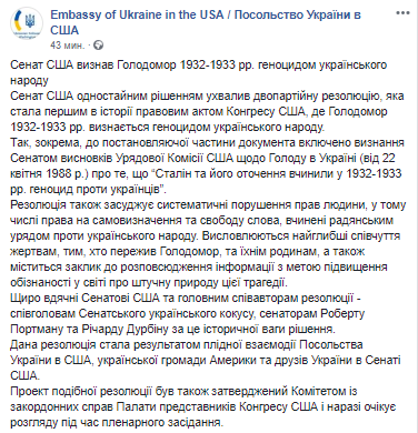 Напомним, Комитет по иностранным отношениям Сената США поддержал резолюцию о признании Голодомора геноцидом украинского народа 26 сентября.
