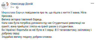 "Мирослава Барчук сообщила о том, что ушла из жизни ее мама, Нила Крюкова. Великая актриса и великий борец. Когда нам была нужна помощь во время Студенческой революции на граните, она пришла и легла на гранит вместе со студентами. Потому что Украина и борьба за нее были в ее сердце. В ее талантливом, смелом и добром сердце. Вспомним великого человека добрым словом ", - написал Доний.