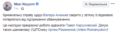Юрист Маси Найем также написал, что Новомосковский городской суд Днепропетровской области закрыл дело против Ананьева "в связи с отказом потерпевшего от поддержания обвинения".