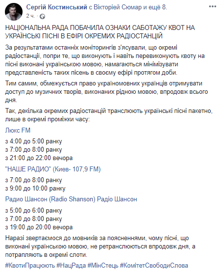 "Отдельные радиостанции, несмотря на то, что они выполняют и даже перевыполняют квоту на песни исполненные на украинском языке, пытаются минимизировать представленность таких песен в своем эфире в течение суток. Тем самым, ограничивается право украиноязычных украинцев на доступ к музыкальным произведениям, выполненных на родном языке, в течение всего дня", - написал член Нацсовета.