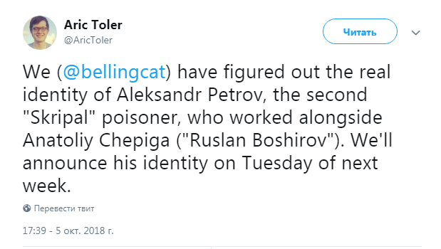 Он проанонсировал, что Bellingcat обнародует эту информацию в ближайший вторник, 9 октября.