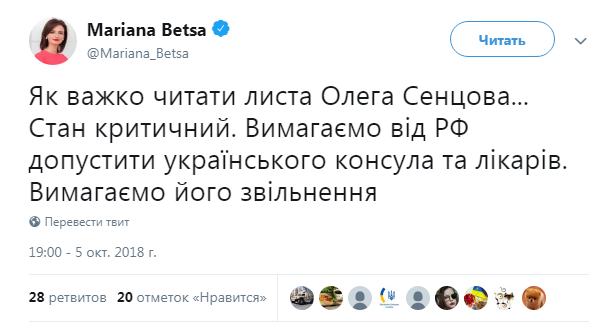 Также она добавила, что в МИД РФ была направлена очередная нота с требованием допустить к Олегу Сенцову украинских и международных врачей, чтобы спасти его.
