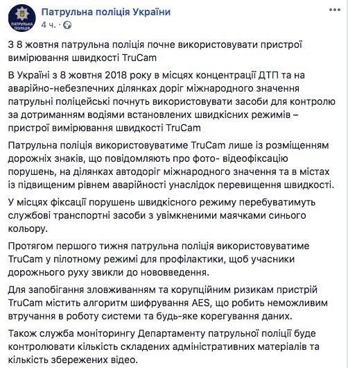 "В Украине с 8 октября 2018 года в местах концентрации ДТП и на аварийно-опасных участках дорог международного значения патрульные полицейские начнут использовать средства для контроля за соблюдением водителями установленных скоростных режимов - устройства измерения скорости TruCam.
