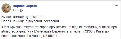 Юрия Крысина, осужденного на пять лет за смертельное нападение в 2014 году на журналиста Вячеслава Веремия, этапировали из столичного СИЗО в исправительную колонию в Донецкой области. Об этом на своей странице в Facebook 8 октября опубликовала пресс-секретарь генерального прокурора Лариса Сарган.
