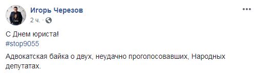 "С Днем юриста! Я бы порекомендовал депутатам сначала почитать тот законопроект, за который вы будете голосовать и подумать о последствиях. Потому что вполне возможно, что многие народные избранники могут разделить участь нардепов, об участи которых я рассказал", - пишет адвокат Игорь Черезов и приводит историю с двумя нардепами, которые сели и теперь не могут выйти из-за ими же принятого законодательства. Через также отмечает, что пока ни один громкий процесс не закончился обвинительным приговором из-за грамотных действий адвокатов.