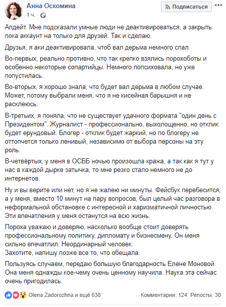 Прежде всего, Анна Оскомина написала, что "умные люди" подсказали закрыть аккаунт и сделать его доступным только для друзей. Однако это сообщение опубликовано в режиме "доступно всем пользователям". Блогерша объяснила, что деактивировала свою учетную запись, чтобы "вал дерьма немного спал". По ее словам, она ожидала бурную реакцию, но ей стало "реально противно". Также Анна предполагает, что ее выбрали для общения с Порошенко, так как она "не кисейная барышня и не расклеится".