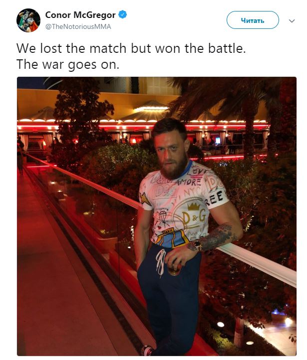 Ирландский боец Конор Макгрегор прокомментировал свое поражение Хабибу Нурмагомедову в бою за титул чемпиона UFC. "Мы проиграли бой, но выиграли битву. Война продолжается", — написал Макгрегор.