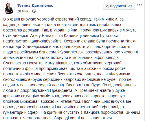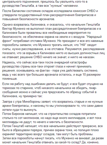 "В Украине взрывается очередной стратегический склад. Таким образом, за каденцию нынешней власти в воздух взлетела тройка крупнейших арсеналов государства. Да, в Украине война и причиной этих взрывов могут быть диверсии. Но в Балаклее и Калиновке виновными были лоси, халатность и козлы отпущения. Охрана складов была усилена только на бумаге. С диверсиями у нас продолжают успешно бороться богатые люди с российским бизнесом. Журналистские расследования о многочисленных злоупотреблениях на складах утонули в море других инфоповодов. Общество молчит. Ему интереснее, кого обматерил очередной политический фрик, а об армии знает, что там с каждым годом растет процент жиров в масле.