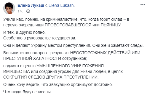 "Учили нас, помню, на криминалистике, что, когда горит склад – в первую очередь ищи ПРОВОРОВАВШЕГОСЯ или ПЬЯНИЦУ. И тех, и других полно. Особенно в руководстве государства. Они и делают Украину местом преступления. Они же и заметают следы.