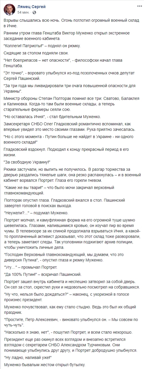 Журналист Сергей Лямец написал ироничную зарисовку о происшествии: "Взрывы слышались всю ночь. Огонь поглотил огромный военный склад в Ичне. Ранним утром глава Генштаба Виктор Муженко открыл экстренное заседание военного кабинета.