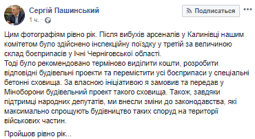Глава комитета Верховной Рады по нацбезопасности и обороне Сергей Пашинский опубликовал в соцсети фото с военного арсенала под Ичней, которые были сделаны год назад во время инспекционной поездки после взрывов военных складов в Калиновке. По словам Пашинского, еще тогда комитет ВР рекомендовал "срочно выделить средства, разработать соответствующие строительные проекты и переместить все боеприпасы в специальные бетонные хранилища".