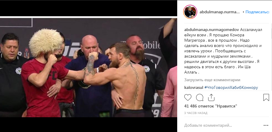 Отец Хабиба Нурмагомедова, который победил в бою Конора Макгрегора, заявил, что простил противника своего сына за высказывания в свой адрес. Об этом он написал на своей странице в Instagram.