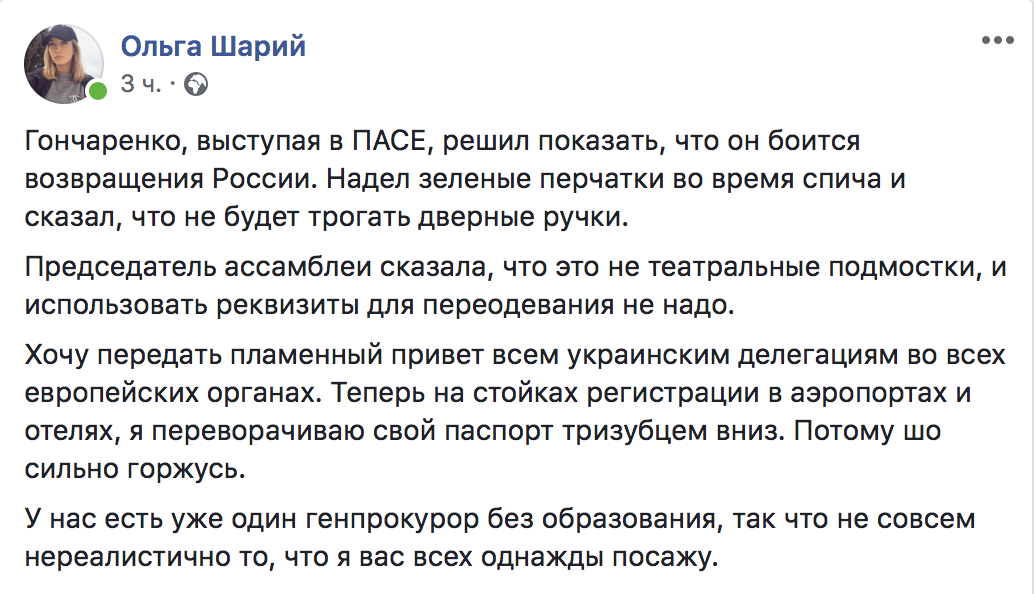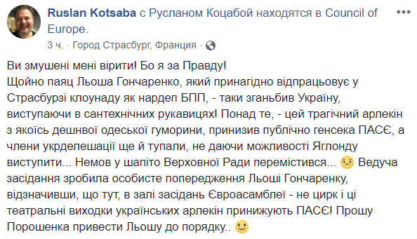 "Только что паяц Леша Гончаренко, который попутно отрабатывает в Страсбурге клоунаду как нардеп БПП, - таки опозорил Украину, выступая в сантехнических рукавицах! Более того - этот трагический арлекин с какой-то дешевой одесской Юморины, унизил публично генсека ПАСЕ, а члены укрделешации еще и топали, не давая возможности Яглонду выступить ...