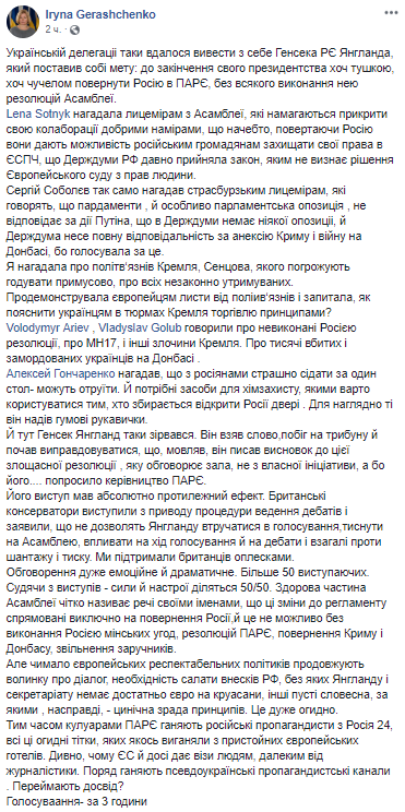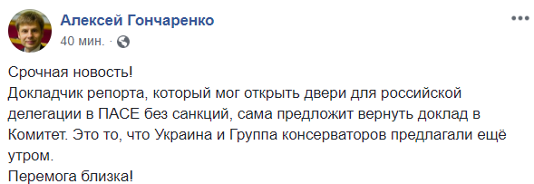 "Докладчик репорта, который мог открыть двери для российской делегации в ПАСЕ без санкций, сама предложит вернуть доклад в Комитет. Это то, что Украина и Группа консерваторов предлагали ещё утром. Перемога близка!", - написал нардеп в Facebook.