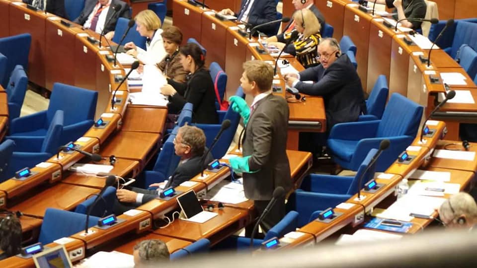 Нардеп Гончаренко пришел на заседание ПАСЕ в резиновых перчатках сантехника