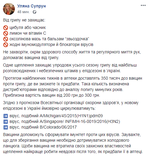 И.о. министра утверждают, что от гриппа не спасут ни лимоны, ни лук, ни бальзам "Звездочка". По словам Супрун, одна прививка защищает на протяжении всего сезона гриппа.
