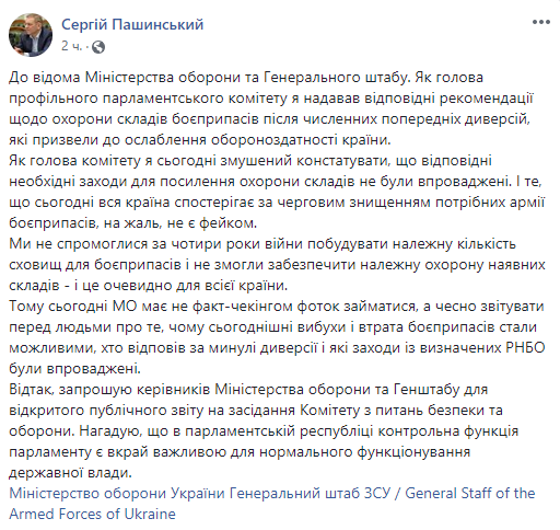 "Сегодня Министерство обороны должно не фактчекингом фоток заниматься (имеется в виду, вероятно, история с публикацией Пашинским у себя в соцсети фейковых фото взрывов со складов - Прим.Ред.), а честно отчитываться перед людьми о том, почему сегодняшние взрывы и потеря боеприпасов стали возможными, кто ответил за прошедшие диверсии и какие мероприятия из определенных СНБО были внедрены", - написал он.