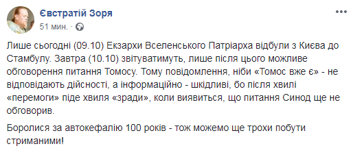 "Только сегодня (09.10) экзархи Вселенского Патриарха отбыли из Киева в Стамбул. Завтра (10.10) отчитываться, только после этого возможно обсуждение вопроса Томосу. Поэтому сообщение, что "Томос уже есть" - не соответствуют действительности, а информационно - вредны, потому что после волны "перемоги" пойдет волна "зрады", когда окажется, что вопрос Синод еще не обсудил", – написал Зоря на своей странице в соцсети Facebook во вторник вечером.