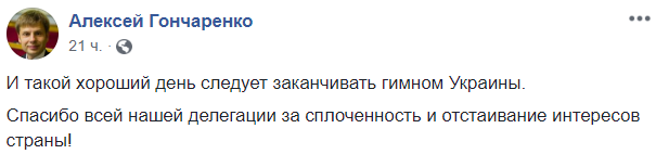 "И такой хороший день следует заканчивать гимном Украины. Спасибо всей нашей делегацией по сплоченность и отстаивания интересов страны!" - прокомментировал нардеп видео.
