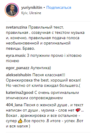 Никитин задал вопрос своим подписчикам - "С чем по-вашему это связано?" В комментариях к этой новости пользователи пишут, что песня "волшебная", музыка неординарная, а текст - правильный. "Отличная неординарная музыка, прекрасный голос"; "Красивое звучание, современно, в данном случае даже не важно кто поет и как выглядит"; "Магия музыки, голоса и языка!" "Правильный текст, правильная, созвучная с текстом музыка и, конечно, правильная подача голоса необыкновенной и орегинальной певицы. Браво". Такие мнения высказывают пользователи Instagram.