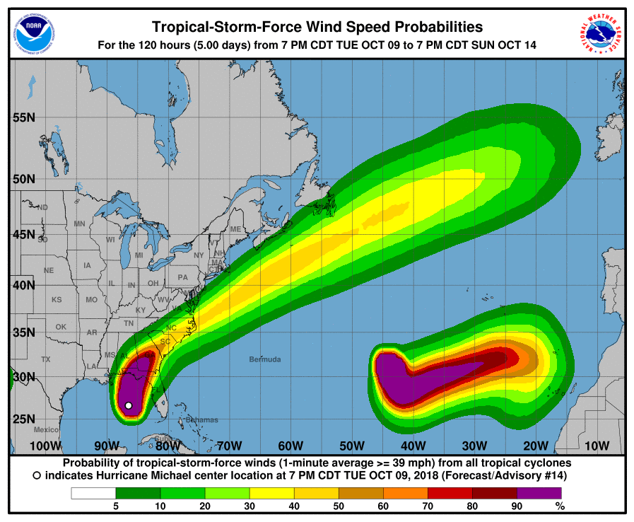 "Майкл" угрожает прежде всего штатам Флорида, Алабама, Джорджия. Дальше, по прогнозам, стихия будет продвигаться по суше вдоль атлантического побережья США.