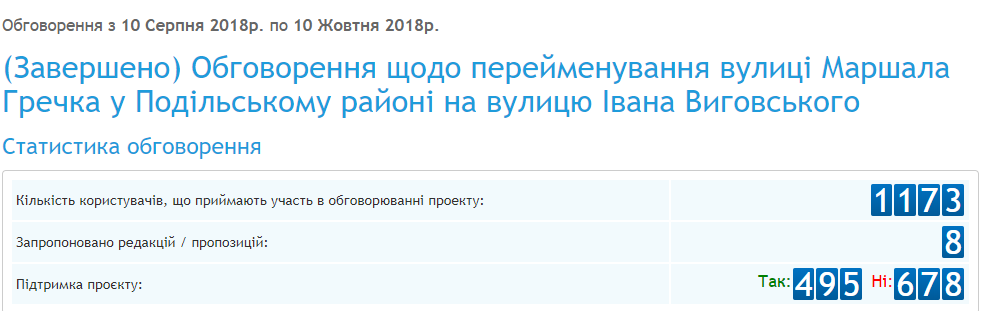 Киевляне не поддержали переименование улицы Маршала Гречко в Подольском районе в улицу Ивана Выговского. "Да" переименованию сказали 495 человек, "нет" - 678.