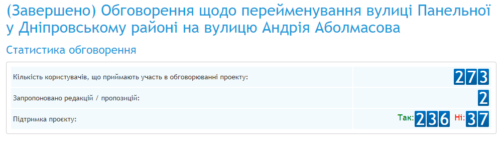 Поддержано было переименование улицы Панельной в Днепровском районе в улицу Андрея Аболмасова. 236 голоса за, против были всего лишь 37 голосовавших.