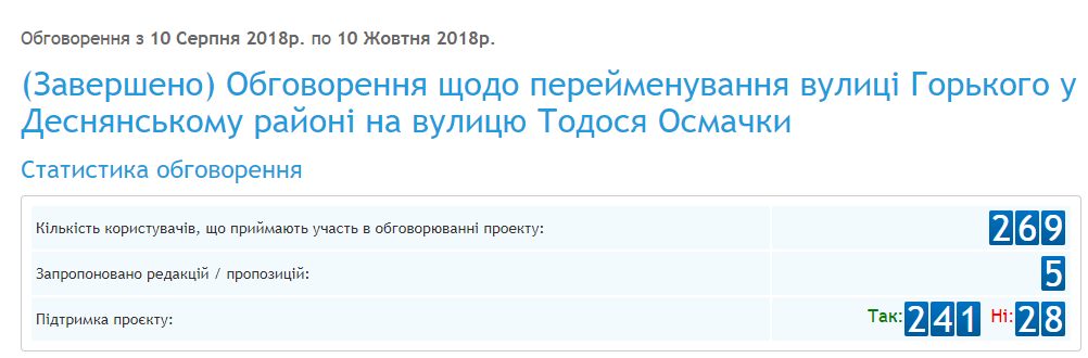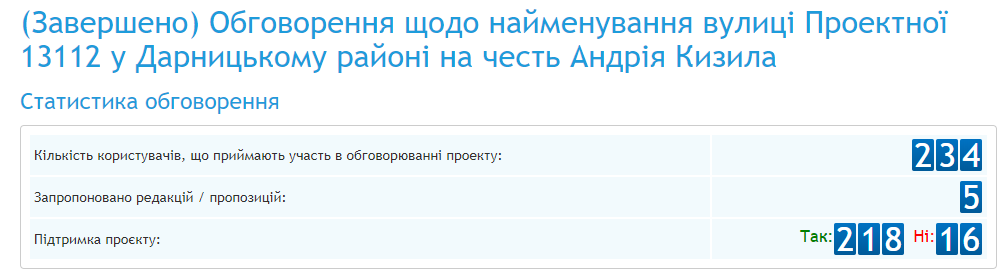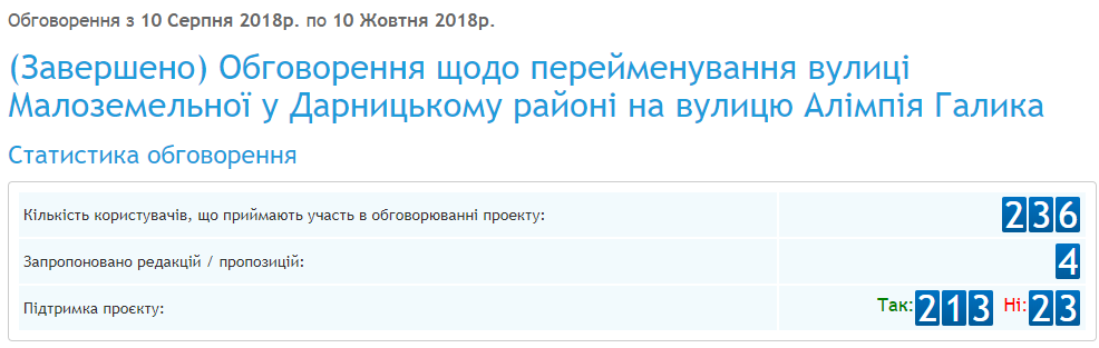 Переименована будет улица Малоземельная в Дарницком районе в улицу Алимпия Галика. Да сказали проекту 213 человека, нет - 23.