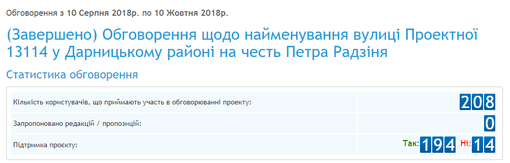 Улица Проектной 13114 в Дарницком районе будет названа в честь Петра Радзиня. За: 194 Против: 14.