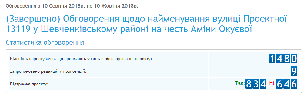 Также поддержано переименование улицы Проектной 13119 в Шевченковском районе в честь Амины Окуевой. За выступили 834 человека, против - 646.