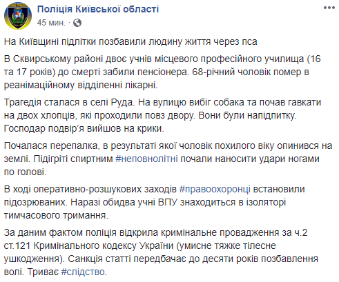 В селе Руда Киевской области двое учеников местного профессионального училища 16 и 17 лет до смерти забили пенсионера. Об этом сообщает пресс-служба полиции Киевской области.