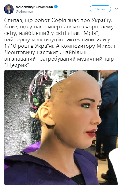 "Спросил, что робот София знает об Украине. Говорит, что у нас - четверть всего чернозема мира, самый большой в мире самолет "Мрия", самую первую конституцию также написали в 1710 году в Украине. А композитору Николаю Леонтовичу принадлежит самое известное и востребованное музыкальное произведение "Щедрик", - написал Гройсман в своем Twitter.