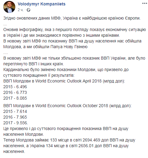 Теперь Молдова по этому показателю занимает 133 место в мире со 2694,469 долл. ВВП на душу населения, а Украина 134 место в мире по 2656,01 долл. ВВП на душу населения.