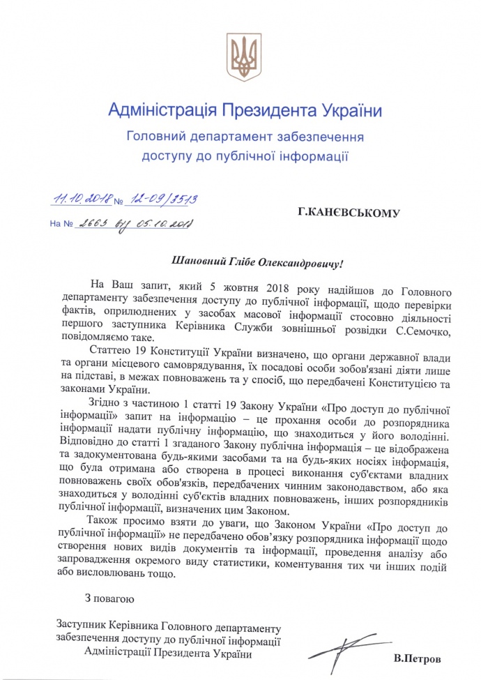 А вот в Администрации Президента на вопрос не ответили, вместо этого Каневскому сообщили, как закон определяет понятие "публичная информация" и добавили, что распорядитель информации не обязан создавать новые виды документов и информации, проводить анализ, комментировать те или иные события и т.д.