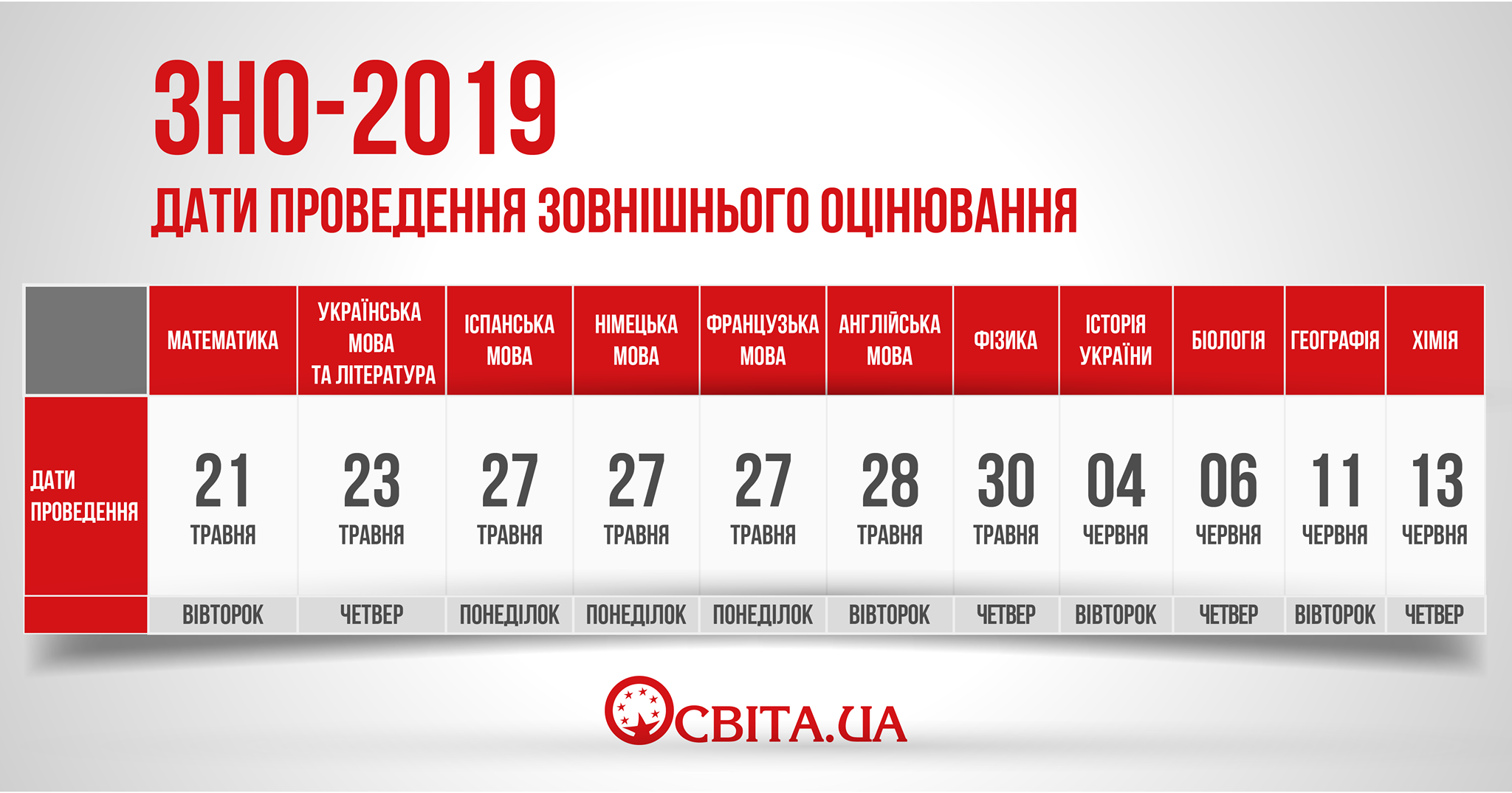 Тестирование тех, кто желает поступить в вузы начнется с экзамена по математике, который пройдет 21 мая. Далее, 23 мая - украинский язык и литература. В один день 27 мая состоится тестирование по испанскому и французскому языкам. 28 мая - английский язык. Экзамен по физике пройдет 30 мая. Историю Украины будут сдавать 4 июня. 6 июня - тесты по биологии. 11 июня - география и завершит сессию экзамен по химии - 13 июня.