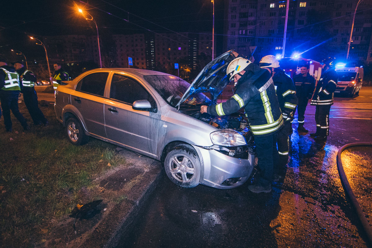 Авария произошла на Оболони. Известно, что Chevrolet Aveo вылетел на разделительную клумбу, снес столб и загорелся.
