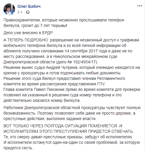По информации Олега Бабича, на сегодняшний день в Единый реестр досудебных расследований внесено дело о незаконной прослушке телефона Вилкула, а правоохранителям, которые ее осуществляли, грозит до 7 лет тюрьмы.