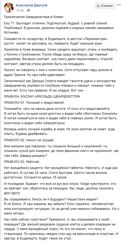 "Приключения Шварценеггера в Киеве. Ему 71. Выглядит отлично. Подтянутый, бодрый, с ровной спиной. Улыбчивый. В джинсах, дорогом пиджаке и модных лаково-замшевых ботинках", - написала она в Facebook.
