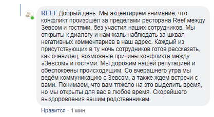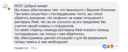 В комментариях к посту с заявлением выступили и представители ресторана. По информации REEF, конфликт к заведению отношения не имеет, он случился за его пределами и без участия охраны и сотрудников. Также сотрудники ресторана могут как очевидцы рассказать о конфликте между гостями и представителями "Зевса", а сам REEF готов оказать помощь семье пострадавшего.