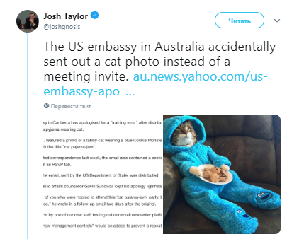 Госдеп США разослал приглашения на вечеринку с котами в пижамах. А потом извинился