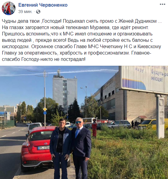 "Чудны дела твои ,Господи! Подъехал снять промо с Женей Дудником ... На глазах загорается новый телеканал Мураева, где идёт ремонт. Пришлось вспомнить,что к МЧС имел отношение и организовывать вывод людей , прежде всего! Ведь на любой стройке есть балоны с кислородом. Огромное спасибо Главе МЧС Чечеткину Н С и Киевскому Главку за оперативность, храбрость и профессионализм. Главное-спасибо Господу-никто не пострадал!".