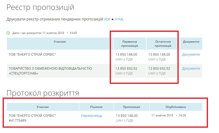 "Энерго Строй Сервис" и его единственный конкурент ООО "Спецторгснаб" предоставили аналогичные документы о представительстве интересов в тендере "Укрзализныци" российского АО "Архангельский фанерный завод" и его украинского дистрибьютора ООО "Орион-Плюс". Разница предложений составила 545 гривен, участники не сделали ни одного понижения стартовой цены.