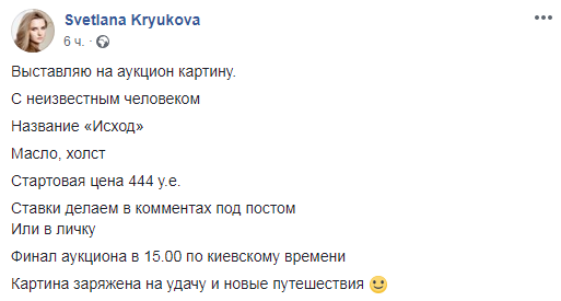 Заместитель главного редактора "Страны" Светлана Крюкова 16 октября выставила на аукцион новую картину. Полотно "Исход" (холст, масло), стартовая цена которого составляла 444 у.е., ушла с молотка за  $5500.